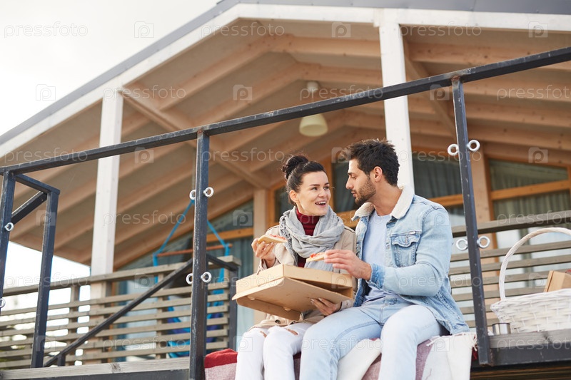 Пара ест пиццу на современном пикнике