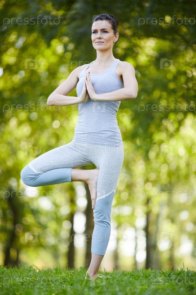 Удовлетворенная леди практикует балансовые упражнения на свежем воздухе