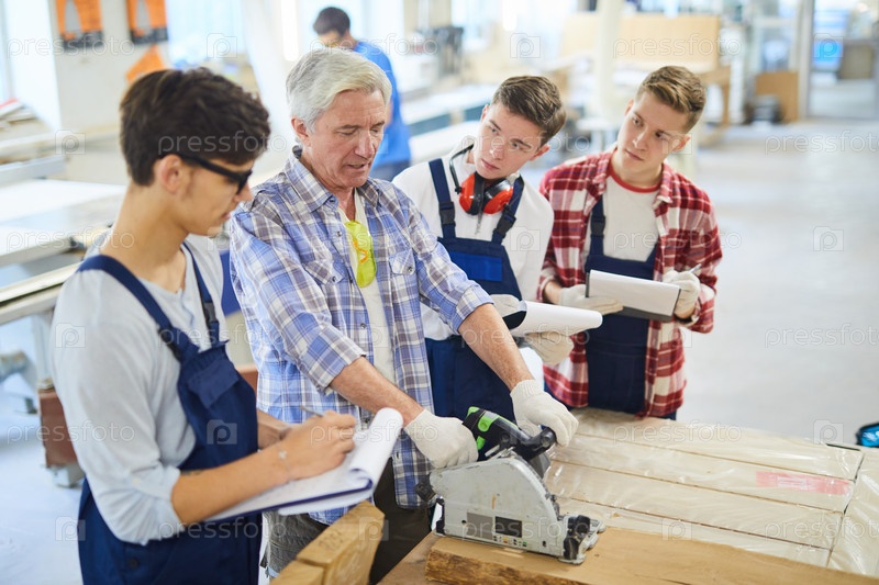 Серьезный плотник, пилящий деревянную доску на уроках по обработке древесины