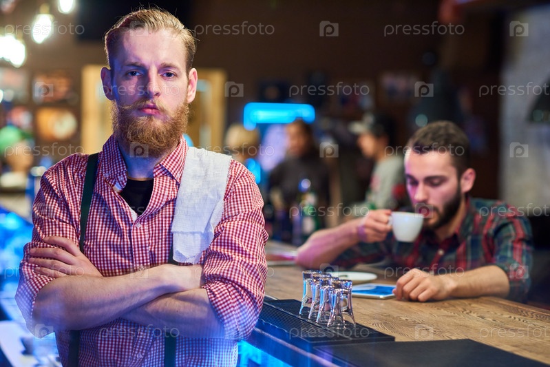 Красивый бармен позирует за стойкой