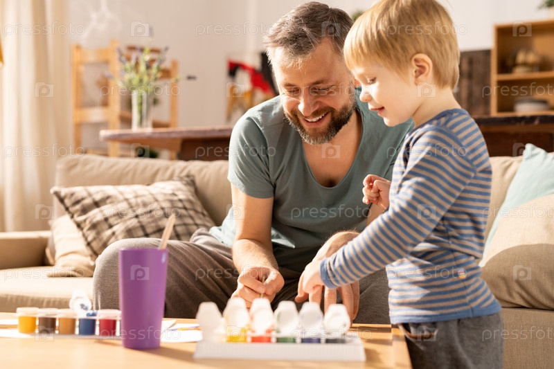 Веселый отец и сын рисуют вместе