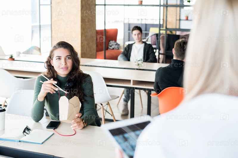 Удовлетворенная женщина ест и разговаривает с коллегой