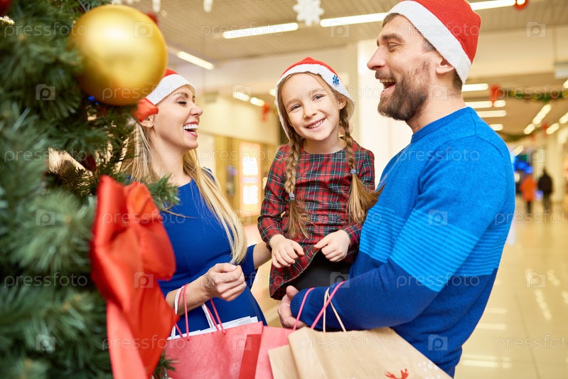 Смеющаяся семья в шляпах Санты стоит в торговом центре