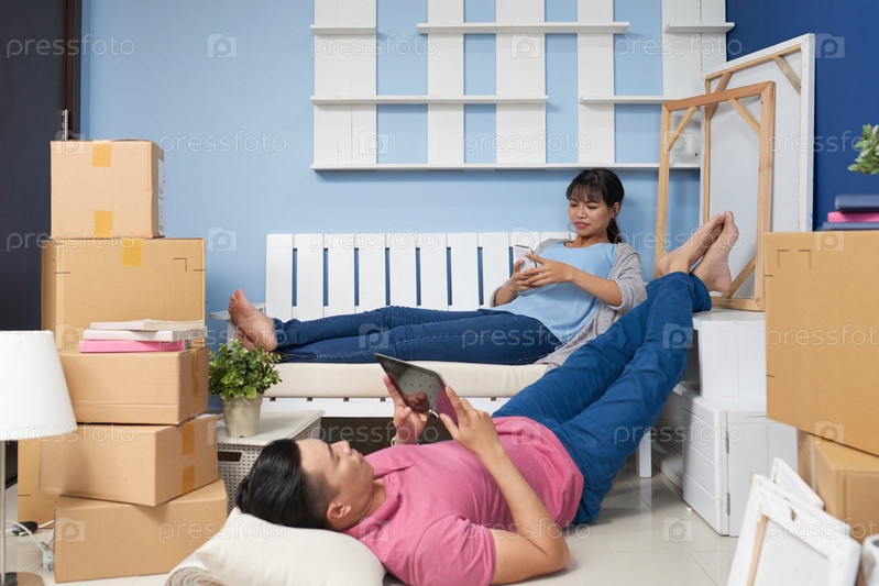 Пара отдыхает после переезда в новую квартиру