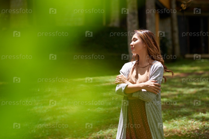 Молодая азиатская женщина, стоящая в солнечных лучах