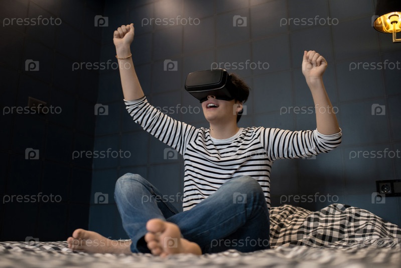 Взволнованный мужчина сидит на кровати, используя очки VR