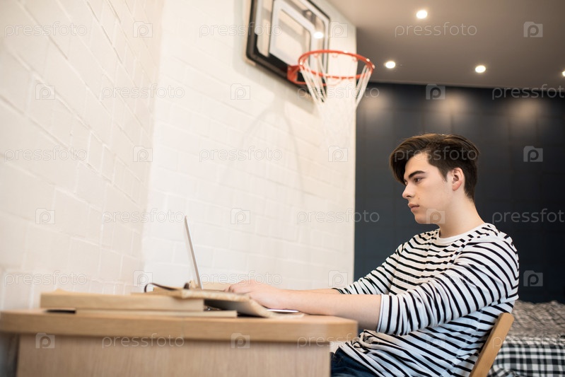 Молодой человек использует ноутбук в спальне