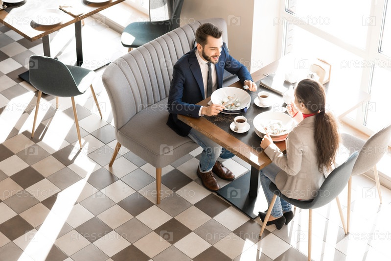 Позитивные коллеги наслаждаются обеденным временем в бизнес-кафе