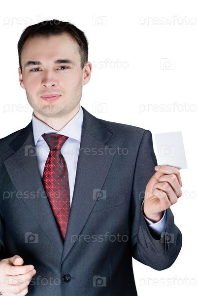 Молодой бизнесмен с визитной карточкой в руке