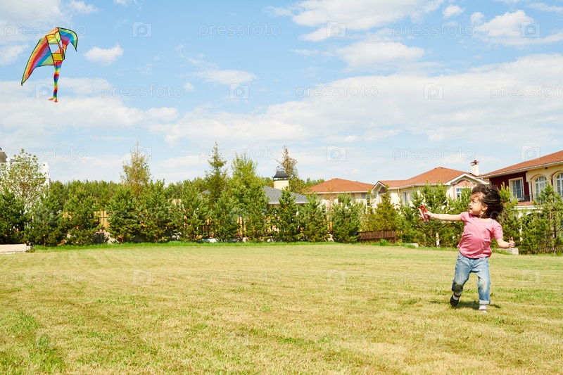 Азиатская девушка, бегущая с воздушным змеем