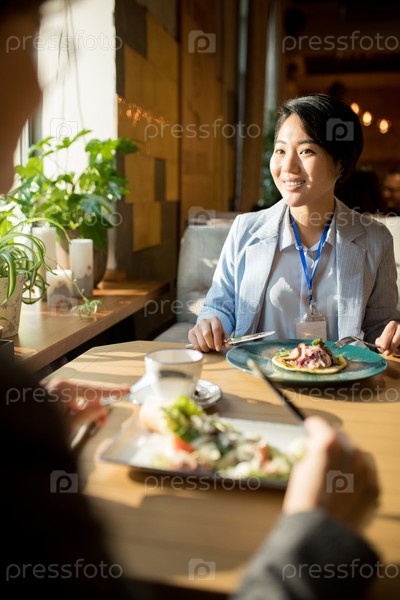 Улыбающаяся азиатская бизнесвуменка обедает с другом