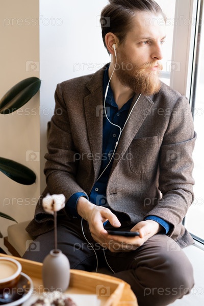 Интроспективный хипстер-мужчина, слушающий музыку в наушниках