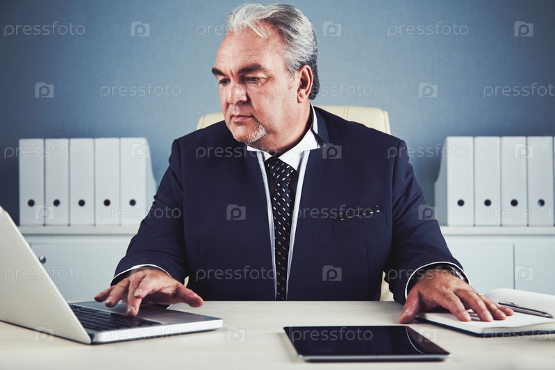 Концентрированный энергичный зрелый бизнесмен, работающий на ноутбуке