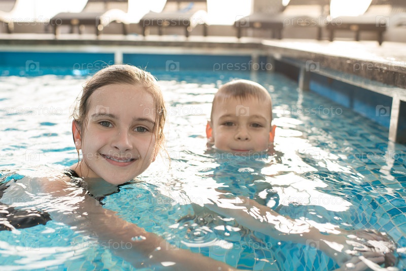 Счастливые дети плавают в бассейне