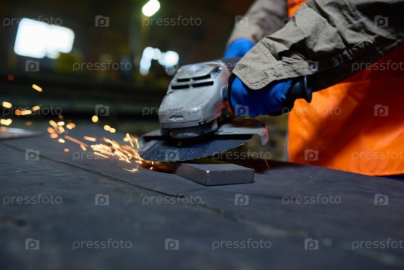 Работник сталелитейного завода, использующий угловую шлифовку