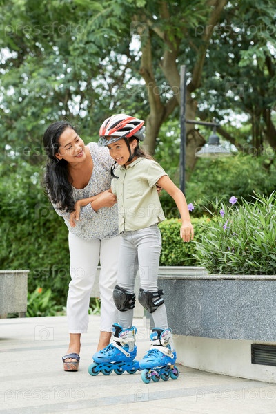 Мать помогает дочери кататься на роликах