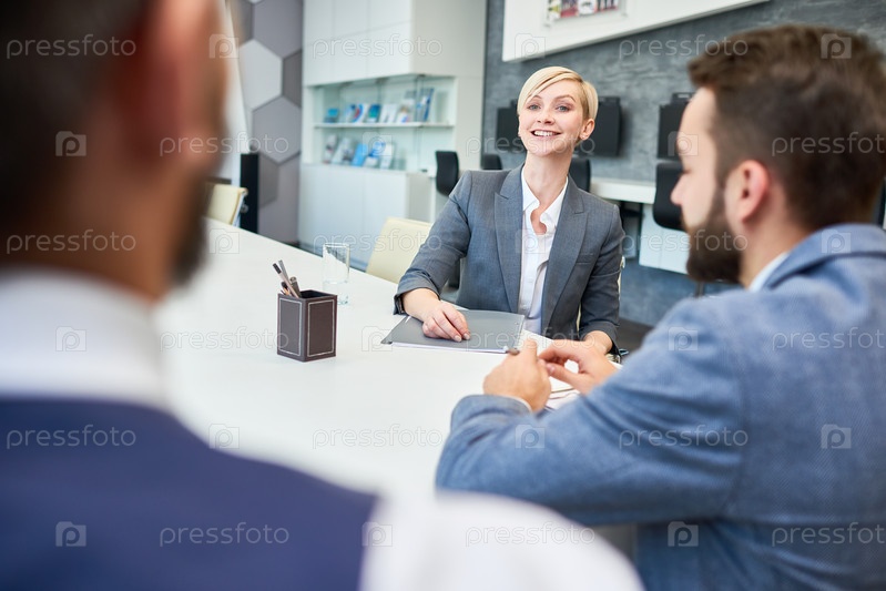 Улыбающаяся деловая женщина встречает партнеров в офисе