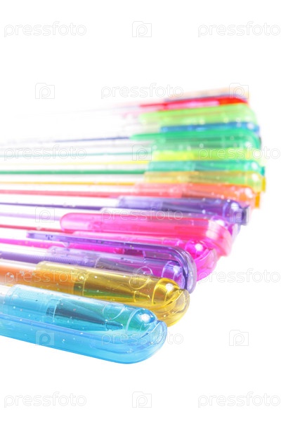 Много разноцветных ручек на белом фоне