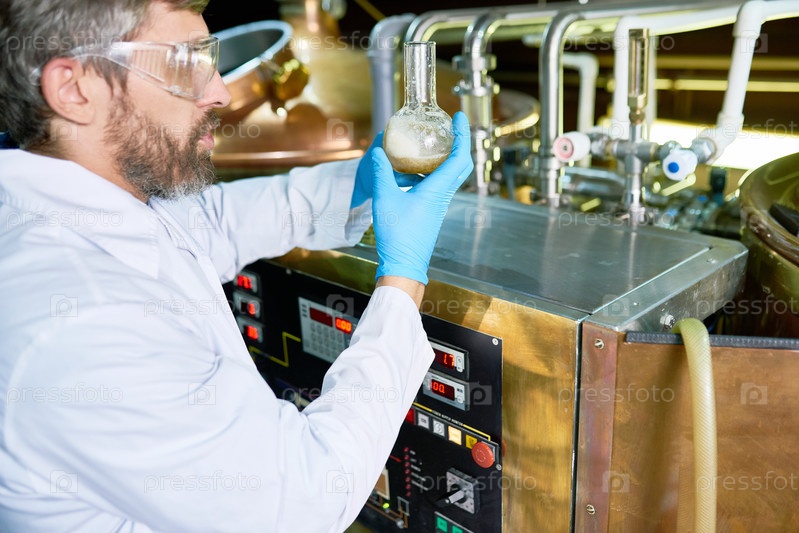 Бородатый пивовар проверяет качество пива