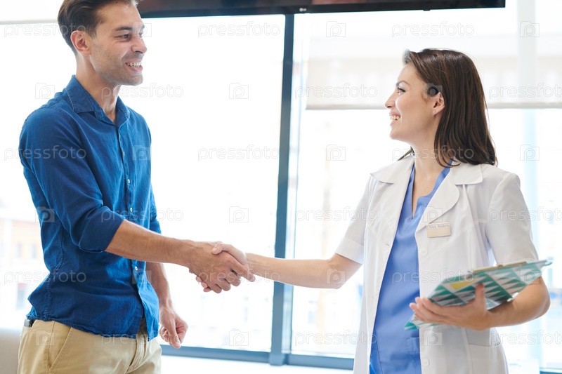 Женщина-врач, приветствующая пациента