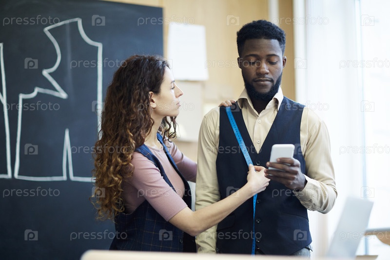 Леди портной принимает меры черного бизнесмена с гаджетом
