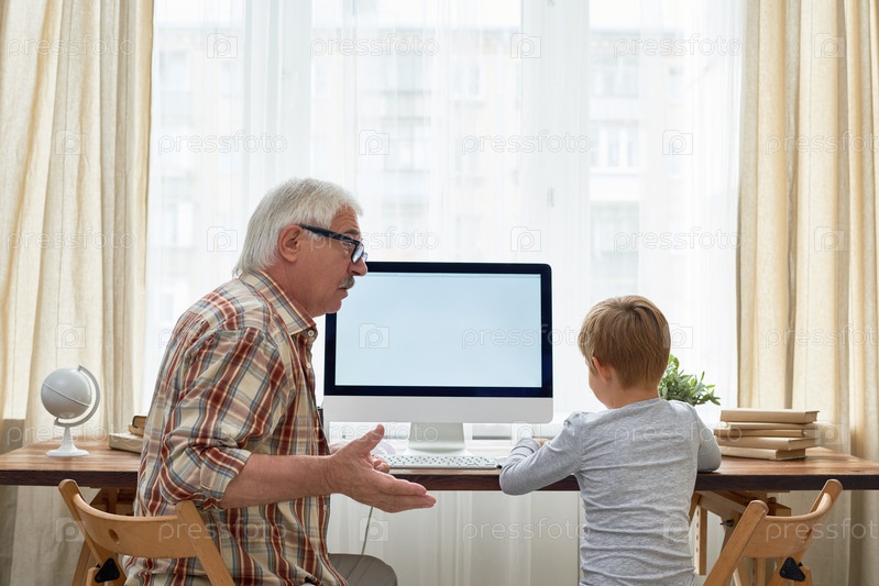 Дедушка помогает мальчику с домашними заданиями