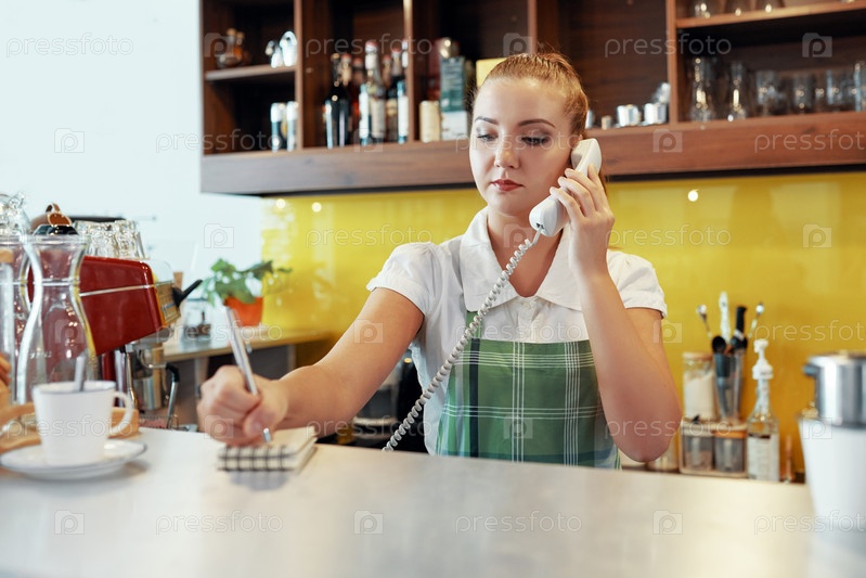 Бариста разговаривает по телефону и пишет в блокноте