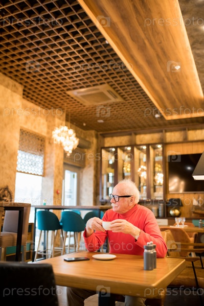 Интроспективный старший мужчина, размышляющий в современном ресторане