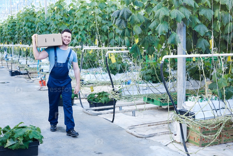 Счастливый фермерский работник, несущий коробку с огурцами