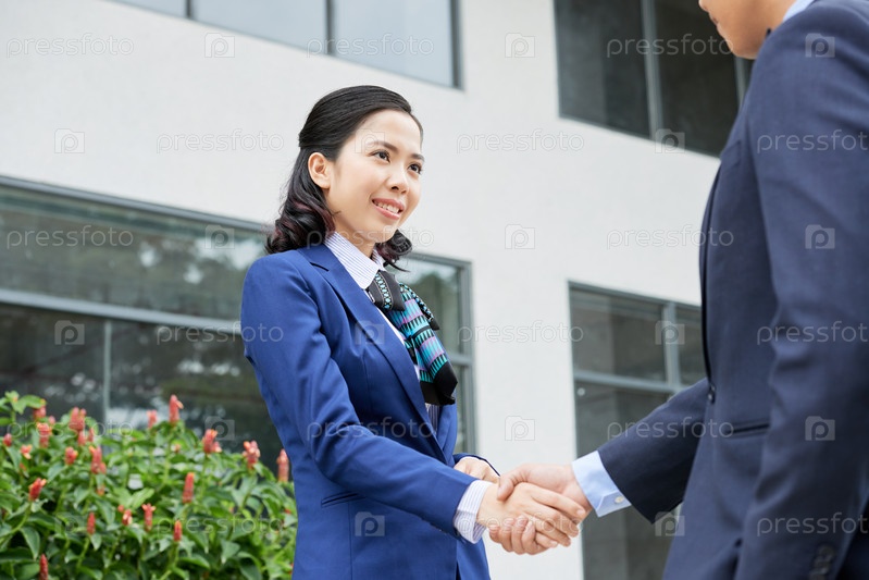 Улыбающаяся азиатская женщина, пожавшая руку коллеге