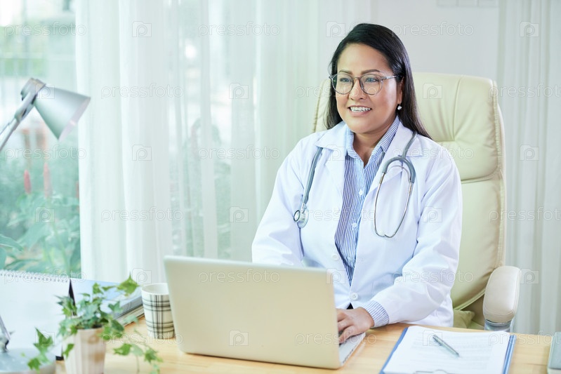 Улыбающийся врач с ноутбуком проводит консультацию в офисе