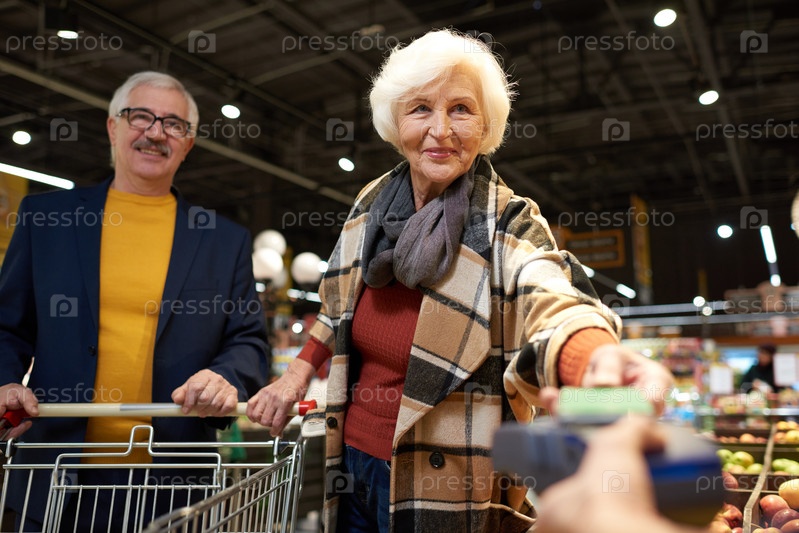 Старшая пара платит с помощью телефона