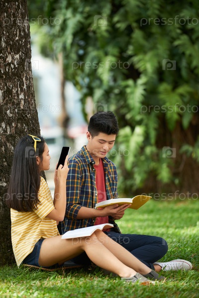Девушка фотографирует читающего бойфренда