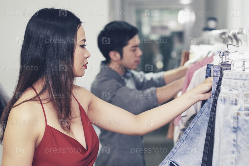 Молодая женщина покупает джинсы