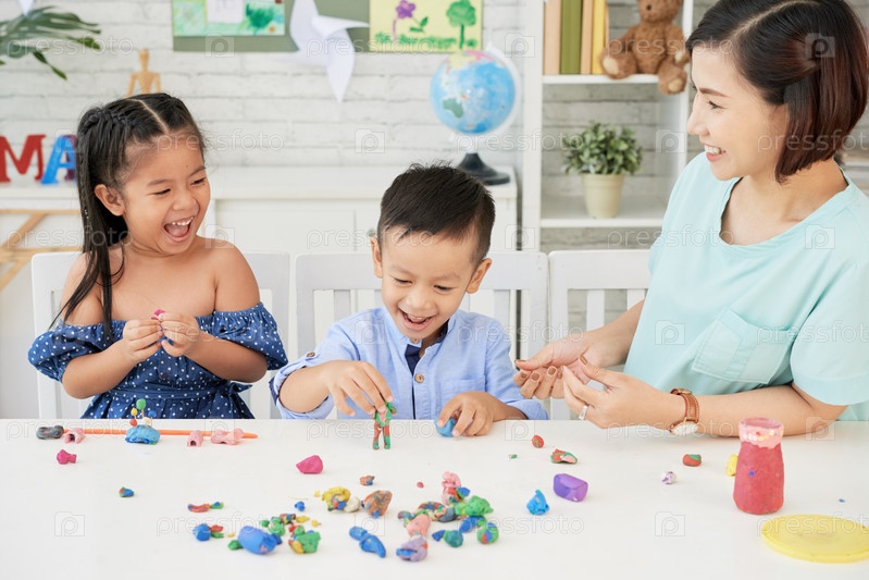 Дети и учительница развлекаются пластилином