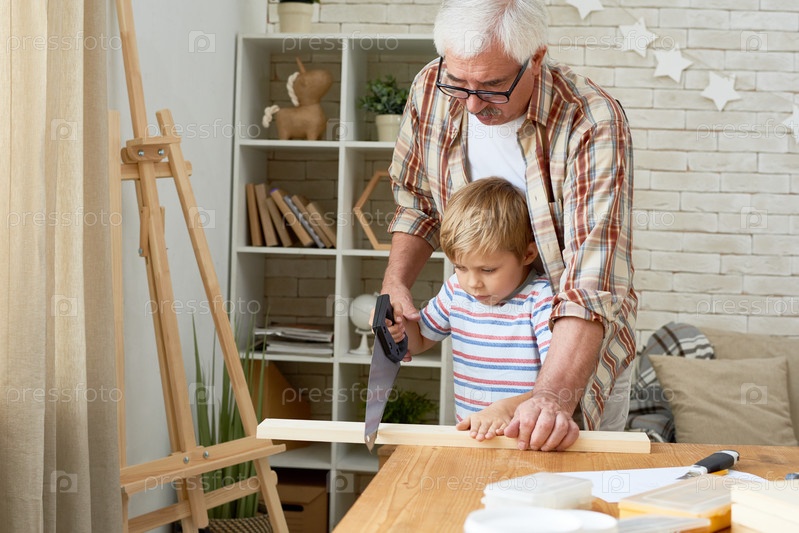 Дедушка и маленький мальчик работают с деревом