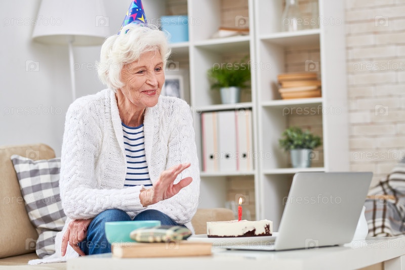 С днем рождения счастливой старшей женщины, разговаривающей через телекоммуникационное приложение