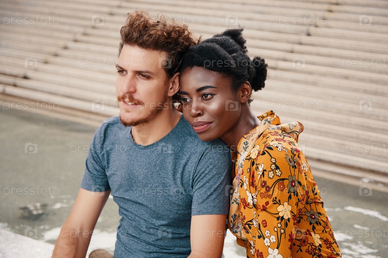 Обнимая красивую многорасовую пару, смотрящую в другую сторону
