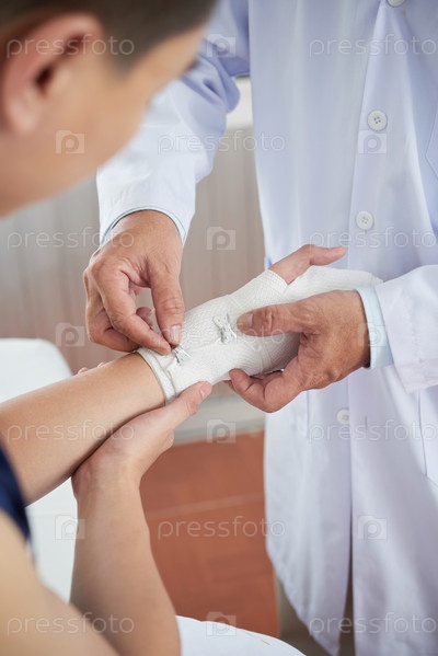 Урожайный врач закрепляет повязку на руке пациента