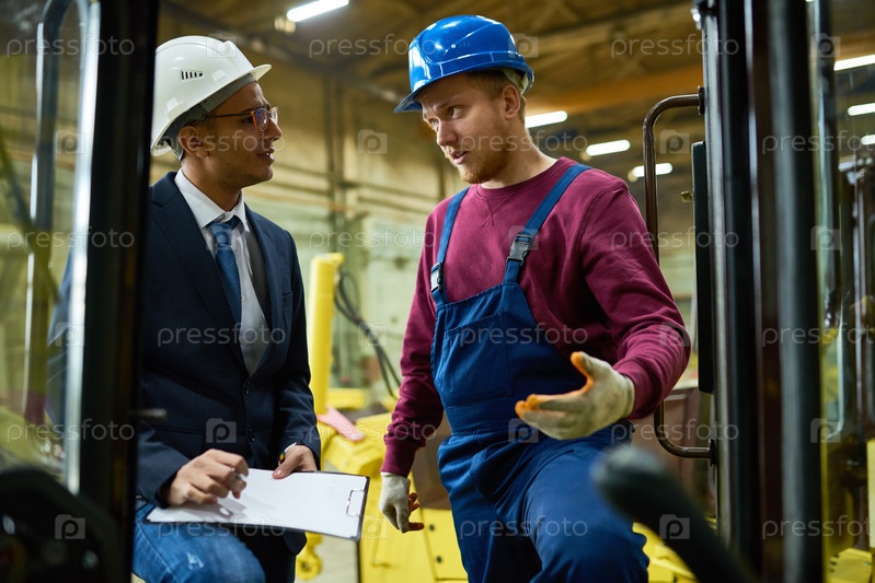 Водитель грузовика разговаривает с бизнесменом