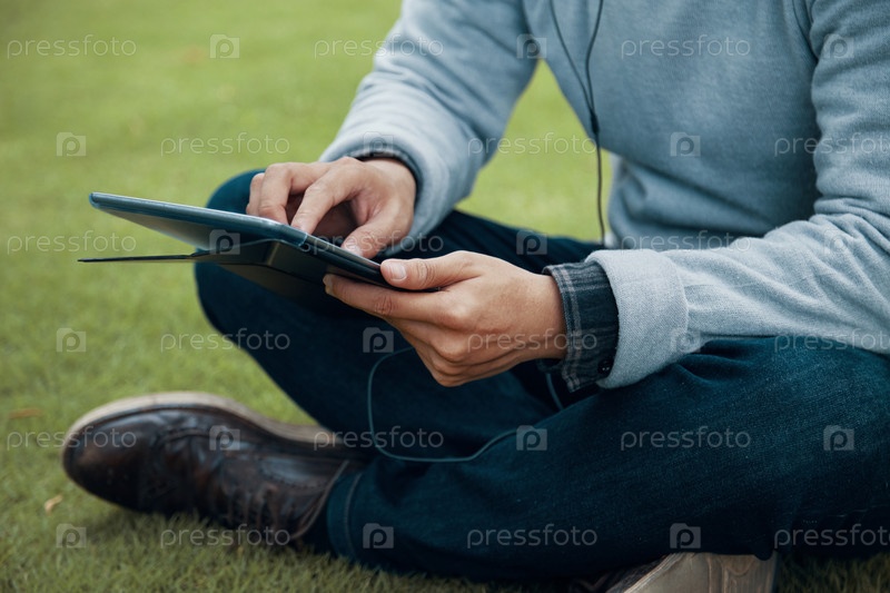 Урожайный человек просматривает планшет на траве