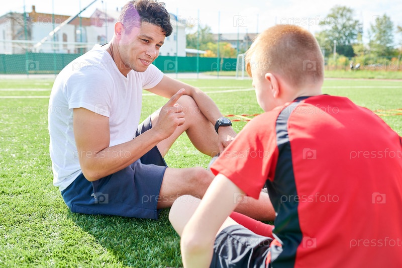 Спортивный тренер разговаривает с мальчиком