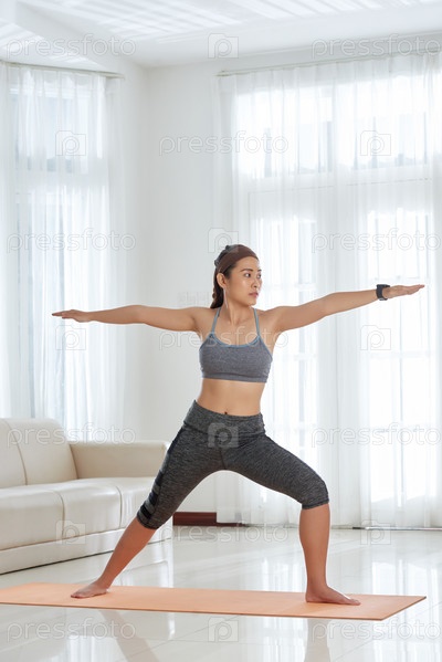 Делая воинскую йогу, женщина позирует