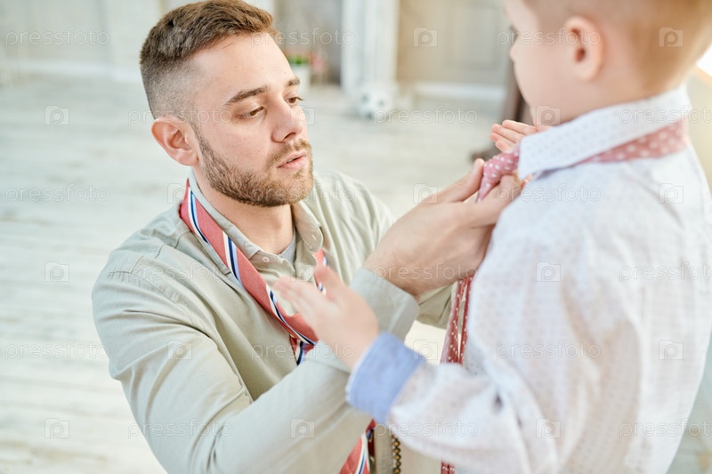Любящий папа вяжет галстук с маленьким сыном