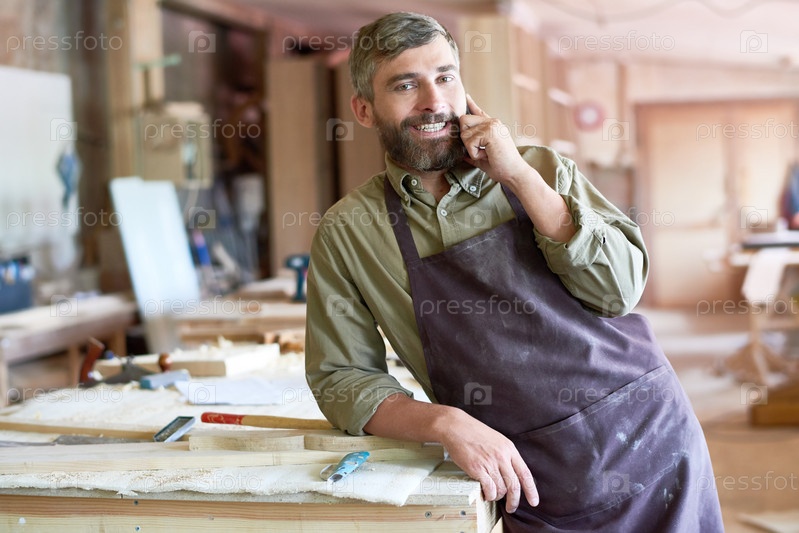 Бородатый плотник говорит со смартфона в современной мастерской