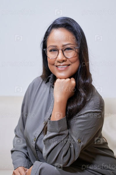 Красивая современная азиатская женщина, опирающаяся на руку