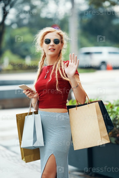 Красивая женщина с телефоном и сумками для покупок