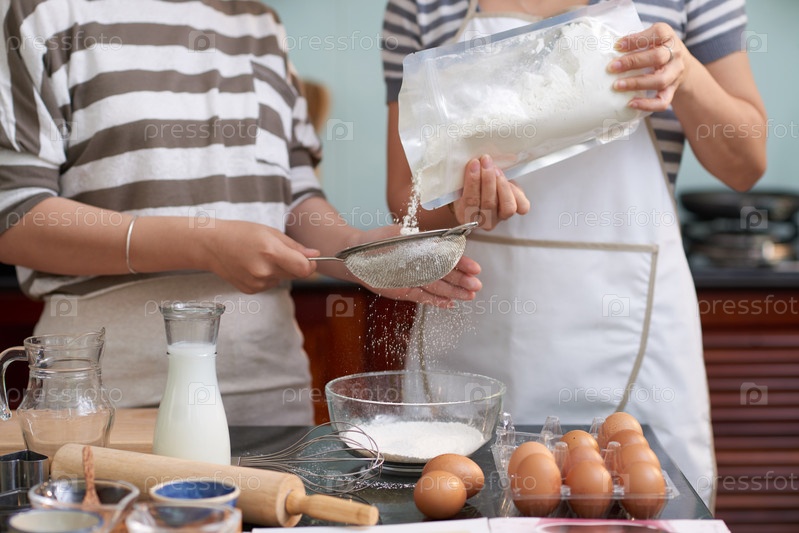 Женщины, просеивающие муку на кухне
