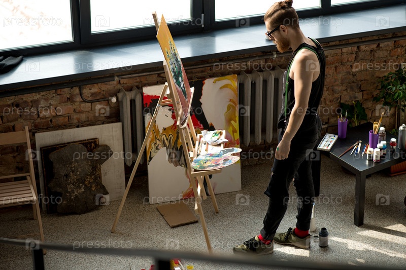 Современный художник смотрит на живопись Мужчина