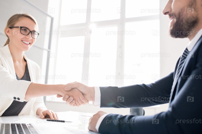 Веселые деловые партнеры, дающие рукопожатие в офисе